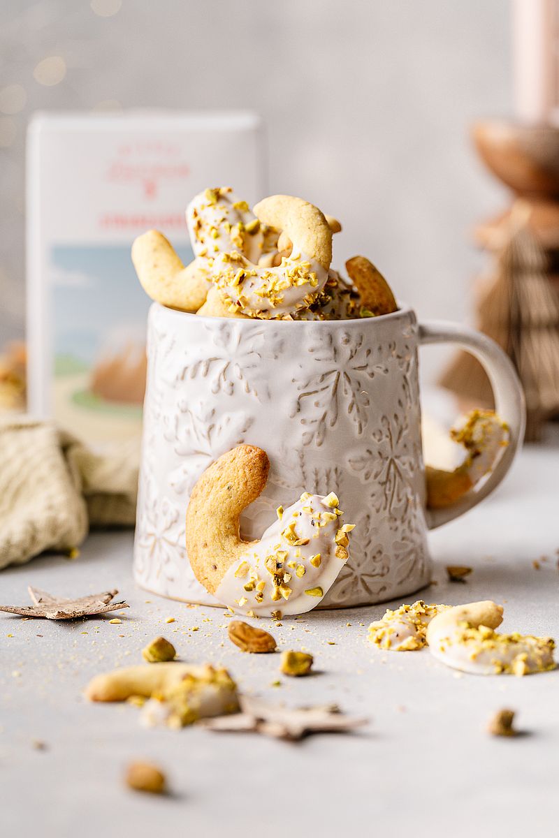 Scufundă jumătate din fiecare cornuleț în glazură, așază-le pe hârtie de copt și presară fistic tocat fin. Lasă-le să se usuce bine, apoi savurează-le imediat sau păstrează-le într-o cutie pentru prăjituri timp de maxim 5–6 săptămâni.